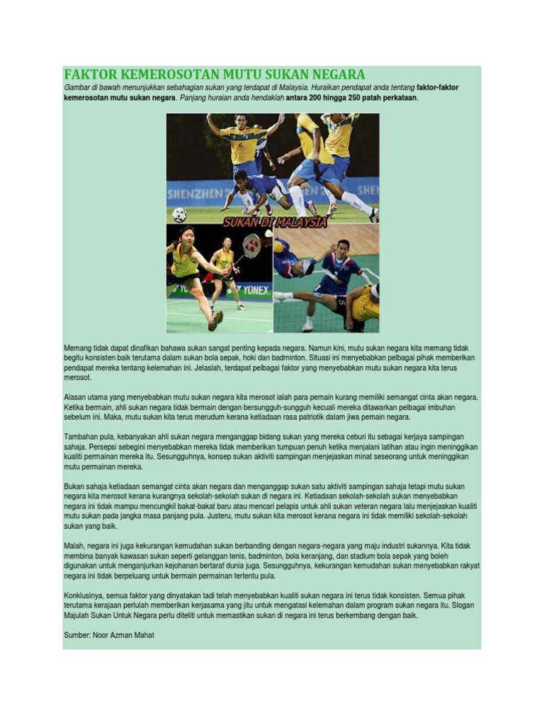 Konklusinya , kemerosotan mutu sukan negara tidak seharusnya dibiarkan terus berlanjutan kerana ia sedikit sebanyak berkaitan dengan maruah kita pada peringkat antarabangsa.